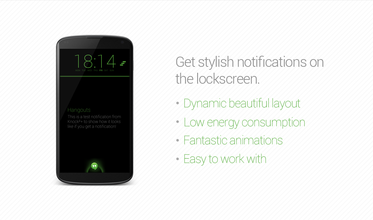 WhatsApp, Facebook, Google+ o SMS, toc ² + soporta todas las aplicaciones. INDIVIDUAL Y pero sencilloAplicaciones deben ser simples, pero también individual. Golpee ² + tiene exactamente estas dos cualidades.Debido al menú estructurado de forma clara que es fácil de adaptar Toc ² + a sus necesidades. No falderal sin sentido. Y si todavía falta una función, estamos aquí para usted. Sólo tiene que enviarnos un mensaje! FUNCIONESAñadimos constantemente nuevas e innovadoras funciones a Knock ² +. Al mismo tiempo, nos aseguramos de que se mantiene la claridad. Toc ² + partituras en las siguientes gamas: