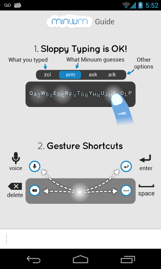 Minuum es un pequeño teclado, unidimensional que libera el espacio de la pantalla, mientras que le permite escribir rápido y con precisión. Escriba con rapidez sin tener que preocuparse acerca de ser preciso, gracias a la corrección automática inteligente.SIMPLIFICADO TÁCTIL TIPIFICACIÓN mayoría de los teclados existentes adoptan un enfoque similar a abarrotar una máquina de escribir completo en un dispositivo con pantalla táctil. Esto nos da teclados que cubren la mitad del espacio de pantalla táctil utilizable (o más), obstruyendo su contenido. Minuum te devuelve el espacio de la pantalla, reduciendo el teclado estándar a una sola dimensión. MINUUM CÓMO FUNCIONA EN LA PRÁCTICA Minuum reinventa el teclado al minimizar un diseño estándar en una sola línea, lo que le permite escribir rápidamente y con precisión sin necesidad de teclas grandes. Este minimalismo se habilita mediante un algoritmo de auto-corrección especializado que permite escribir muy impreciso. Estos algoritmos se interpretan, en tiempo real, la diferencia entre lo que se escribe y lo que quieres decir, hacer las cosas bien, incluso si no cumple con cada letra.DESCUBRE MÁS El teclado lineal Minuum para pantallas táctiles es sólo el primer paso hacia un "tipo de lugar" futuro . Minuum le permitirá escribir en dispositivos portátiles como los relojes inteligentes, dispositivos de juego, y más dispositivos de tamaño mínimo. Mediante el apoyo a esta aplicación, que sirvan para que esa visión.CARACTERÍSTICAS DEL TECLADO MINUUM UN VISTAZO más espacio de pantalla recuperar más de la mitad del espacio de la pantalla táctil utilizable se pierde al escribir en los teclados virtuales tradicionales. SLOPPY PULSAR RÁPIDO Tipo rápido sin tener que preocuparse acerca de ser preciso, gracias al inteligente de auto-corrección. GRAN DEDO FRIENDLY Uso magnificación clave a través de una vista de zoom para la entrada precisa de letras, números y puntuacion, especialmente útiles si tienes los dedos grandes. FAMILIAR distribución del teclado Usted ya sabe cómo escribir con Minuum-es sólo la disposición QWERTY, minimizado. ARREGLOS alfabeto diferente Elige entre los diseños de teclado alternativo, como "QWERTZ", "AZERTY", "AZ".FUNCIONALIDAD COMPLETA Cómo todo lo que esperas en un teclado (por ejemplo, puntuacion, el espacio, la tecla de retroceso y escriba) sin perder su espacio en la pantalla. EXPANSION DEL MISMO TAMAÑO PARA TECLADO Pulse con dos dedos sobre el teclado para cambiar entre mini y de tamaño completo los modos (útil para las direcciones URL y contraseñas). INTELIGENTE predicción de palabras Acelerar su escritura mediante la elección de sugerencias hechas por un motor predictivo que aprende de usted, basado en su lista de palabras, combinaciones de palabras, y los patrones de uso de la lengua. VOCABULARIO DE CONTROL Minuum aprende de su vocabulario, y se puede eliminar palabras en su diccionario, aunque un práctico display pop-up. ATAJOS GESTO Deslice los dedos hacia las esquinas para acceso rápido y conveniente a todas las funciones mediante las teclas de pop-up. IDIOMA CAPACIDAD versiones beta iniciales del teclado Minuum son Inglés solamente, pero a medida que amplíe la prueba beta te animamos a que nos dé la regeneración en support.minuum.com sobre la adición de diferentes idiomas. VOZ PULSAR entrada de texto experiencia de manos libres a través de Google Voice Typing para escribir-voz a texto cuando se realizan otras actividades.