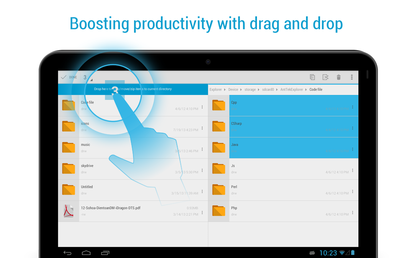 Este es el primer explorador de archivos multi-panel sobre el sistema operativo Android. Cuenta con "arrastrar y soltar en cualquier lugar" para traer la mejor experiencia de usuario. Arrastrar y soltar en cualquier lugar