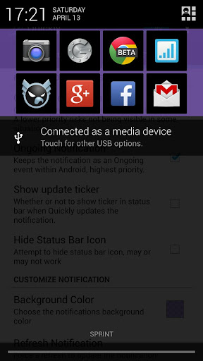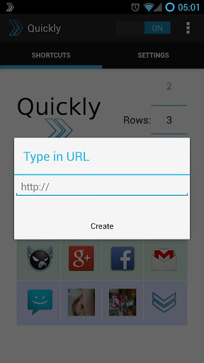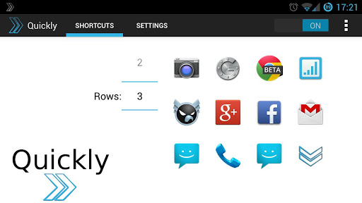 es rápidamente una aplicación sencilla que crea una notificación en curso en el cajón de su notificación lleno hasta 12 accesos directos a un lanzador de aplicaciones o aplicaciones que se pueden configurar. Una vez creada la notificación, expanda la notificación para ver los accesos directos. Lo bueno de rápidamente es que nunca se ejecuta en segundo plano, y el único recurso del sistema que utiliza es de aproximadamente 800kb por sus notificaciones. Es ligero y eficiente, y se mantendrá de esa manera. NOTA : . Si usted está usando un Android 4.1, tendrá que usar una pizca de ampliar gesto para mostrar los accesos directos cuando se derrumbó la notificación "Este complemento utiliza movimientos de arrastre, no movimientos. golpetazo pizca del centro al borde del área de notificación para obtener los accesos directos a la pantalla, y desde el borde hasta el centro para contraerlo. " ¿Qué hay en esta versión: (Actualizado: 30 de Septiembre de 2013)